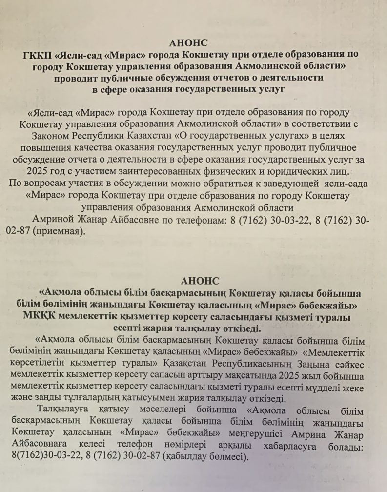 "Ақмола облысы білім басқармасының Көкшетау қаласы бойынша білім бөлімінің жанындағы Көкшетау қаласының "Мирас" бөбекжайы" МКҚК